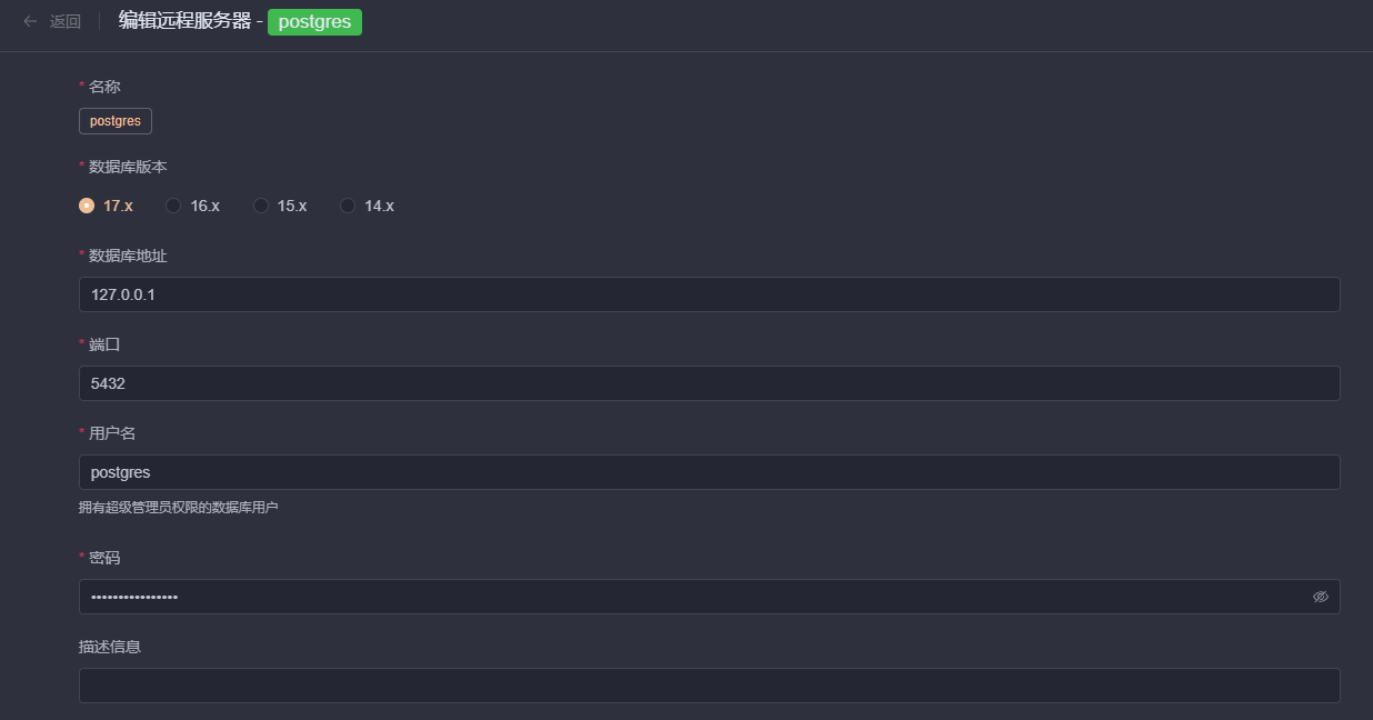 启动容器,按照如下设置,ip可以不填会自动分配一个空闲ip。挂载目录:本机/data/1panel/apps/postgresql/my-postgre/data,容器:/var/lib/postgresql/data。我的1panel安装目录在/data,请自行修改。环境变量:POSTGRES_PASSWORD=自行定义